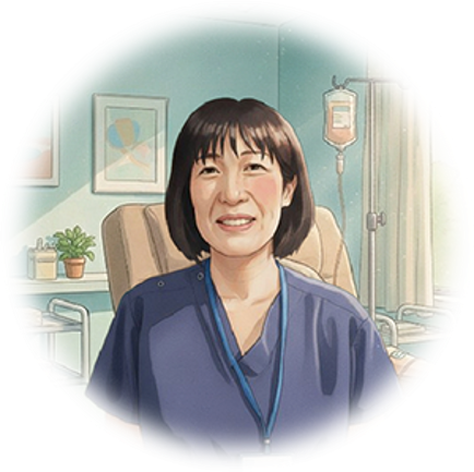 私は、抗がん薬治療における安全管理と副作用マネジメントを軸に、治療前の説明から投与中の観察、緊急時対応、在宅療養への移行まで、患者さんを継続的に支援しています。 生活・就労の両立を支えるため、外見の変化、栄養、服薬管理などの相談にも丁寧に対応し、多職種と連携して、安心して治療を続けられる環境づくりに努めています。